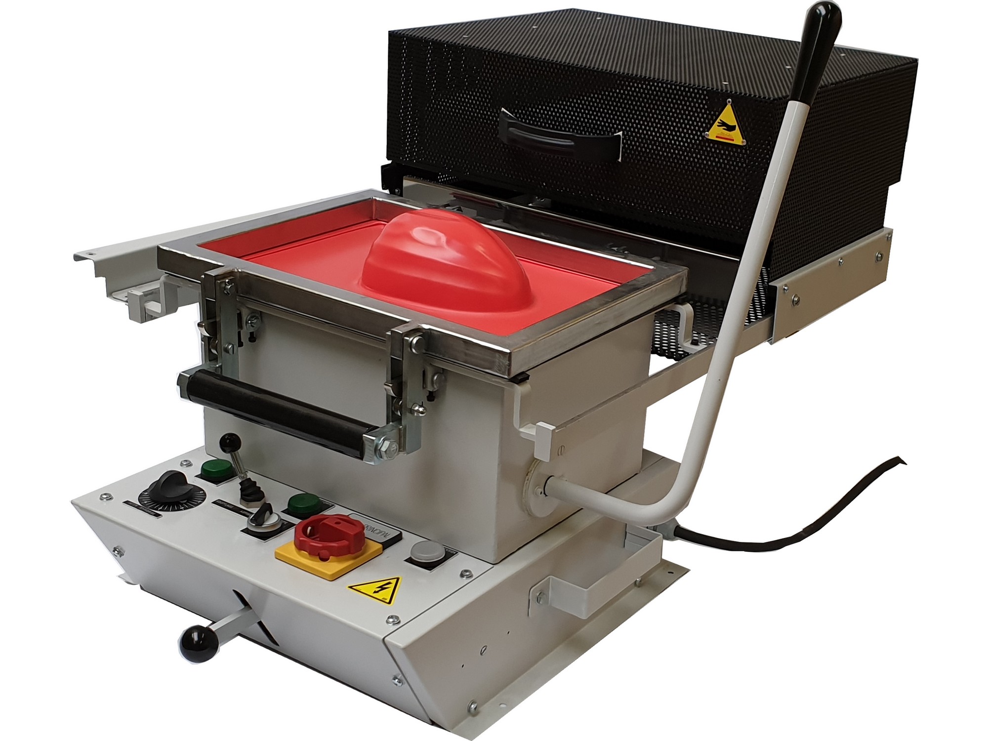 Le moule est placé sur le plateau mobile. L’opérateur installe la feuille de plastique dans le cadre puis tire le caisson chauffant en position avant. Lorsque la chaleur a ramolli le plastique, l’opérateur recule le caisson chauffant, met en marche la pompe à vide et monte le moule situé sur le plateau à l’aide du levier. La feuille de plastique est plaquée sur le moule, elle refroidit en quelques secondes et conserve la forme du moule.